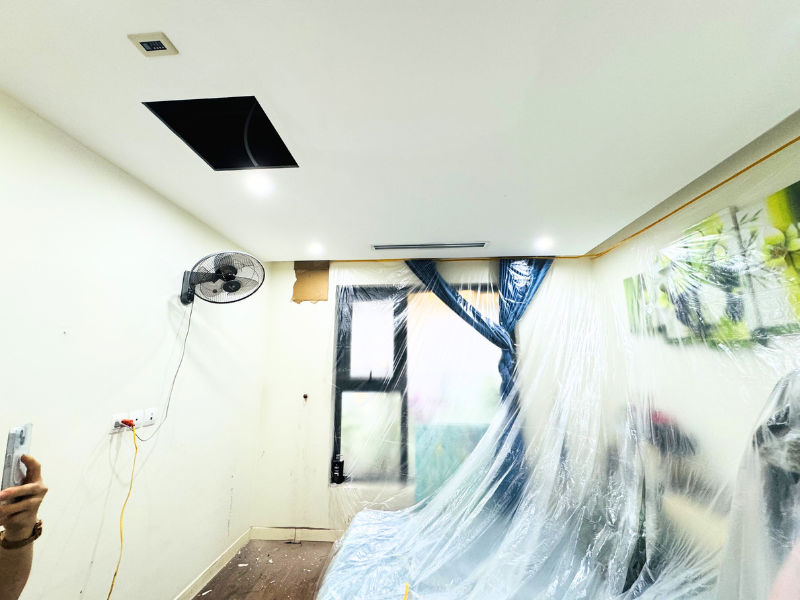 Kỹ thuật cắt lỗ: Chỉ cắt một vài điểm nhỏ trên trần thạch cao để đưa đường ống vào các phòng ngủ và phòng khách.