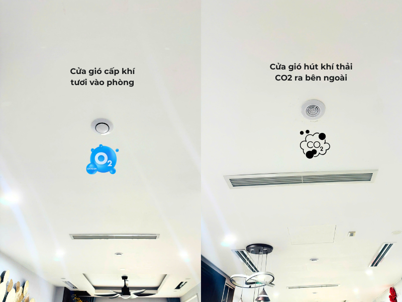 Tại phòng khách: Lắp đặt 2 cửa xả khí tươi và 2 cửa hút khí thải, tạo luồng khí đối lưu liên tục.