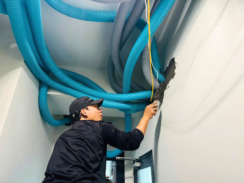 Xử lý hoàn thiện: Sau khi đi ống xong, các vị trí khoan cắt được kỹ thuật viên bả và chát lại tỉ mỉ, trả lại mặt bằng thẩm mỹ 100% cho chủ nhà.